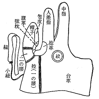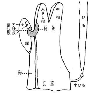 | O | 紐 | 緒または紐 | − | − | 紐 | ひも(または緒) | 懸紐 | 緒または紐 | 紐 | ひも(または緒) | 緒 | |