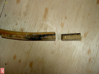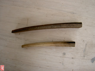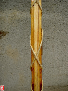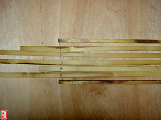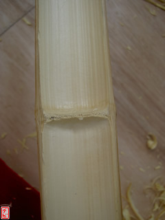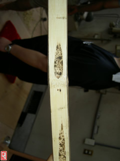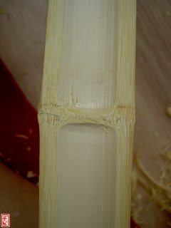 【デビ】竹弓の外竹・内竹には真直ぐな「芽竹」が使われているので、皆さんご使用の竹弓の節を一度観察してみてはいかがでしょうか。竹は一節ごとに交互に枝を出しますから、「節目(芽の出るくぼみ)」が見つけられますよ。