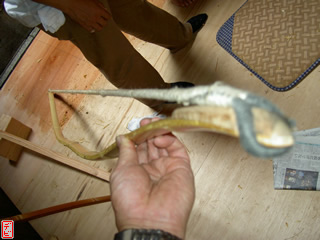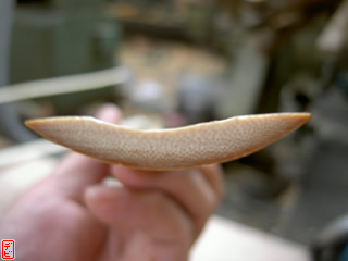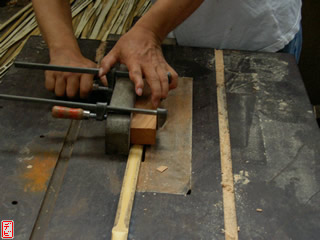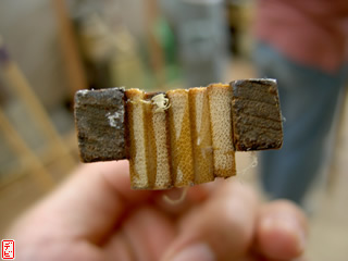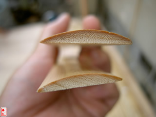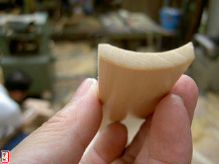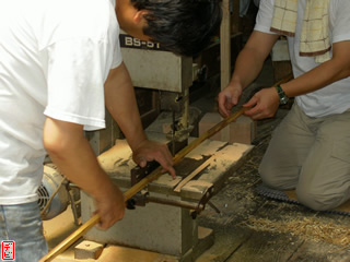 側木には櫨(ハゼ)を用います。物によっては「縄目」などの杢がみられます。側木を適切な厚みに切りそろえます。【写真3-1, 2, 3】